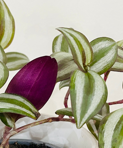 Tradescantia zebrina, (silver inch plant) is a house plant with variegated leaves that are green, purple and silver. It is an easy plant to care for, is tolerant of neglect and looks great in a hanging planter or on a shelf with it has a trailing habit.
